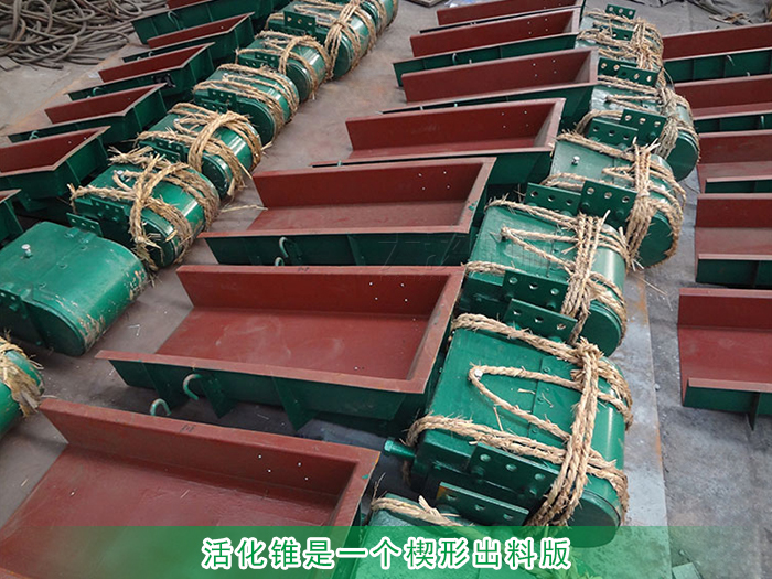 活化錐是一個楔形出料版,小頭向上,固定在共振體上,由於激振器產生的激振力的作用,活化錐在振動方向上和共振體一起作近似於簡諧振動。通過活化錐產生向上的力,將水平振動高效地傳遞到頂部物料,振動力所產生的擾動能量鬆動物料使其下落。