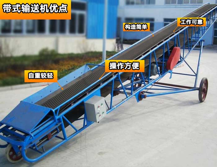 帶式輸送機是輸送機中使用為普遍的型式。它具有構造簡單,工作可靠,自重較輕,操作方便等優點,膠帶輸送機可用來在水平方向或坡度不大的傾斜方向 輸送各種散堆裝貨物和重較輕的成件貨物。在裝車機和卸車機中膠帶輸送機用以接收從鬥式提升機拋來的貨物,並把它裝入車內或卸至貨位上。