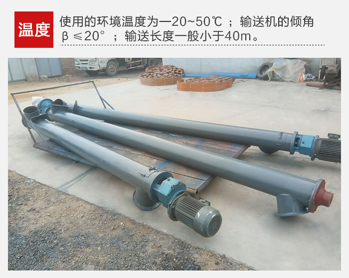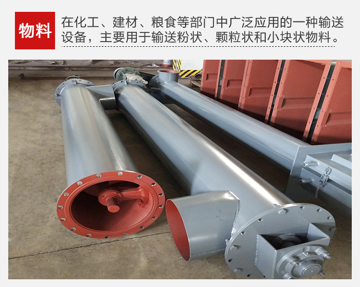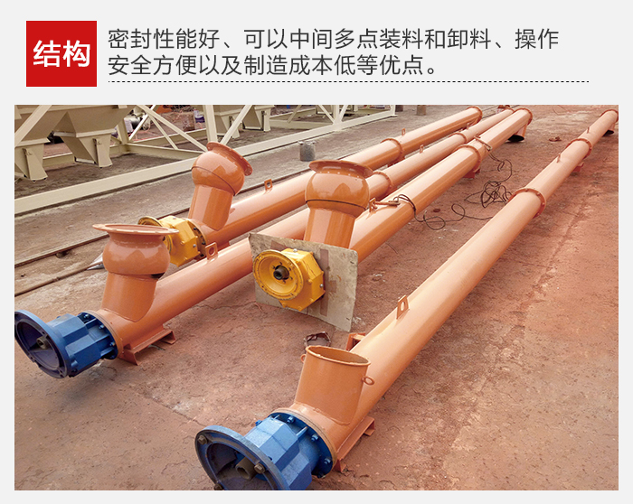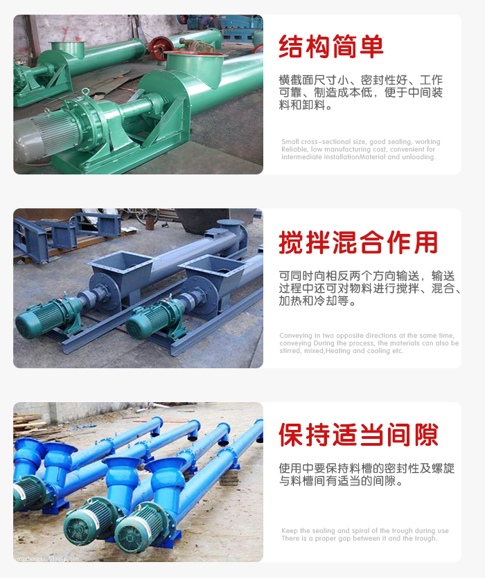 結構簡單、橫截麵尺寸小、密封性好、工作可靠、製造成本低,便於中間裝料和卸料,輸送方向可逆向,也可同時向相反兩個方向輸送。輸送過程中還可對物料進行攪拌、混合、加熱和冷卻等作業。通過裝卸閘門可調節物料流量。但不宜輸送易變質的、粘性大的、易結塊的及大塊的物料。輸送過程中物料易破碎,螺旋及料槽易磨損。單位功率較大。使用中要保持料槽的密封性及螺旋與料槽間有適當的間隙。