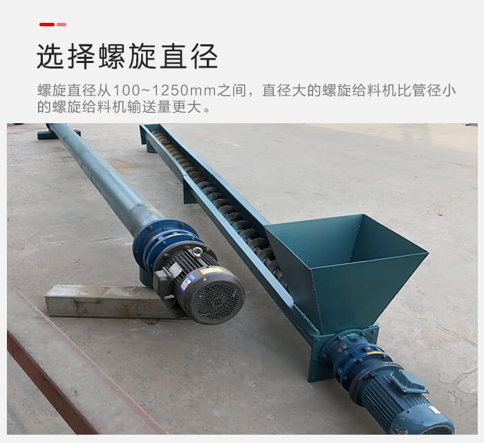 螺旋給料機螺旋直徑從100~1250mm之間,選擇不同的管徑對於單位時間輸送量是有直接的影響的,直徑大的螺旋給料機比管徑小的螺旋給料機輸送量更大。