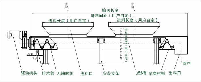 水平主要由驅動裝置、中間軸承、螺旋軸、螺旋體、螺旋葉片、頭部、中部、尾部、進出料裝置等部件組成。