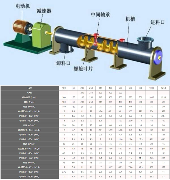 螺旋直徑從 200 毫米到 500 毫米,共有五種規格,長度從 4 米 到 70 米 ,每隔 0.5 米一檔,選型時符合標準公稱長度,特殊需要可在選配節中另行提出。