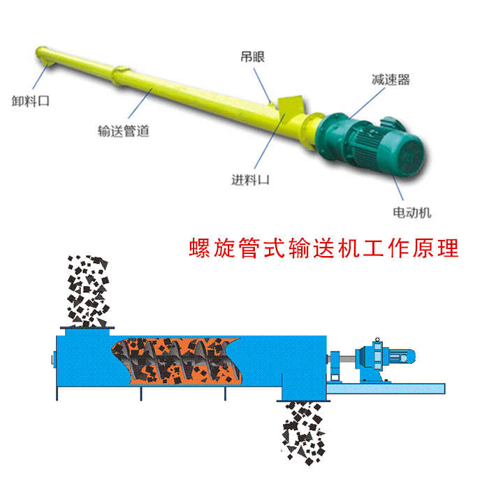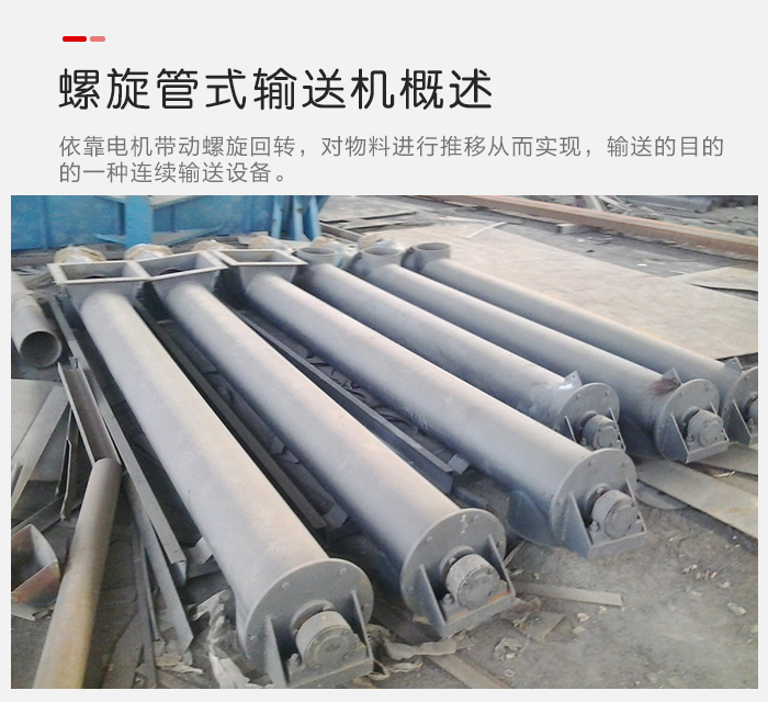 螺旋管式輸送機是依靠電機帶動螺旋回轉,對物料進行推移從而實現,輸送的目的的一種連續輸送設備,可以水平,傾斜,垂直輸送粉末,顆粒及小塊狀物料。有結構電簡單,橫截麵小,密封性好,操作方便,維修員容量的。
