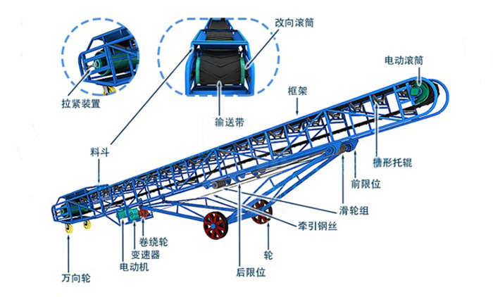 帶式輸送機主要由輸送帶、驅動裝置、滾筒、托輥、張緊裝置、清掃裝置等組成。輸送帶是輸送機的主體部件,用於承載物料並傳遞動力。驅動裝置通常包括電動機、減速器和聯軸器,提供動力驅動輸送帶運行。滾筒用於支撐和傳遞輸送帶的運動力,托輥支撐輸送帶並減少摩擦。張緊裝置用於調整輸送帶的張緊度,保持適當的張力。清掃裝置用於清除輸送帶上的雜物,保持輸送帶清潔。這些組成部分協同工作,使帶式輸送機能夠高效、穩定地完成物料的輸送任務。